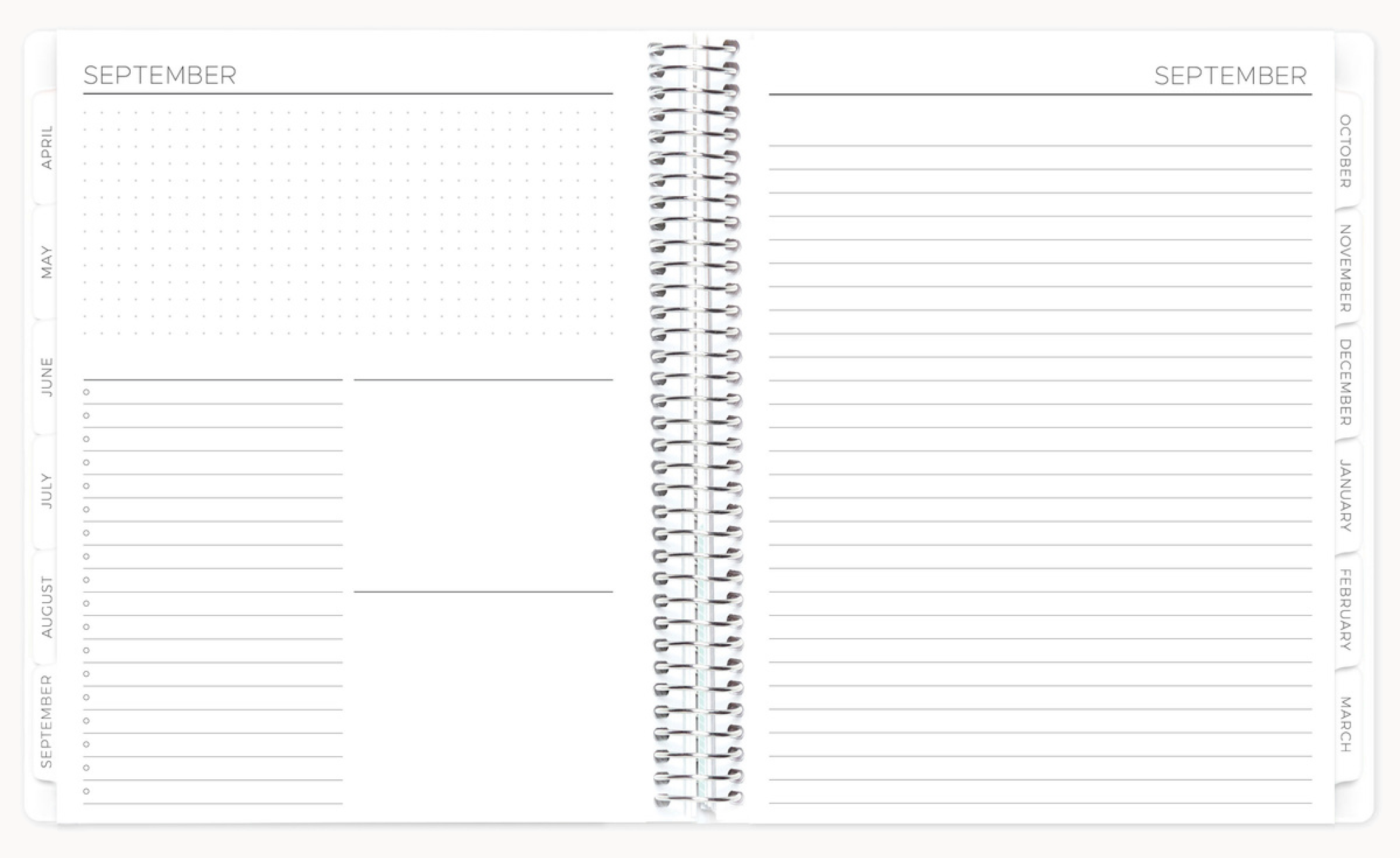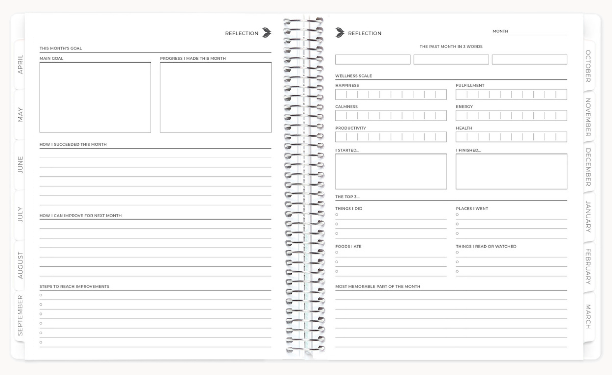 Use the monthly preview pages to think ahead and keep track of stretch goals and activities.