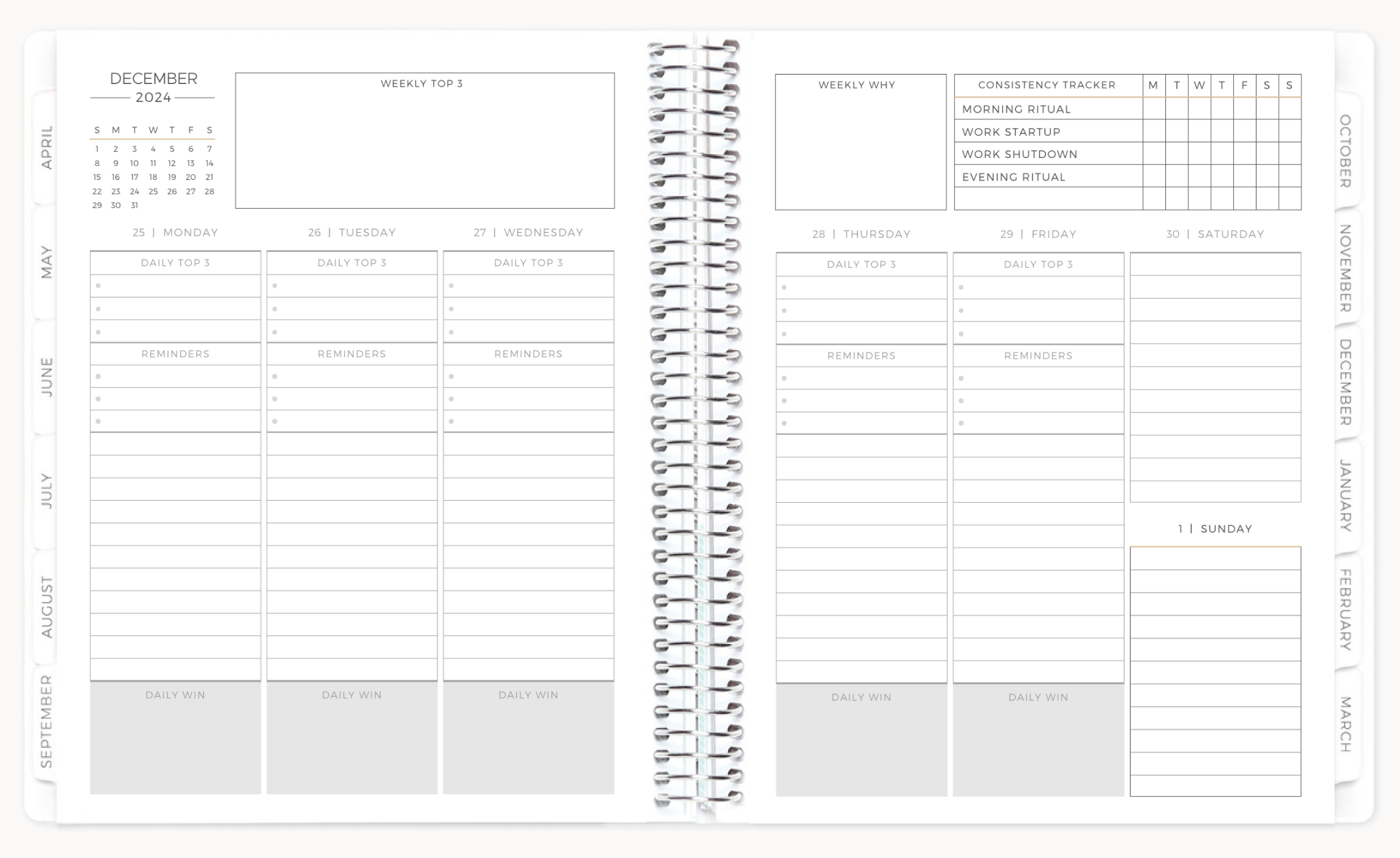 This 2025 planner is customized to support your best year yet. Based on methods proven to drive goal achievement, this simplified system for planning will get you on track and keep you there. End 2025 year with the peace of mind knowing just how much you accomplished at work and in life.